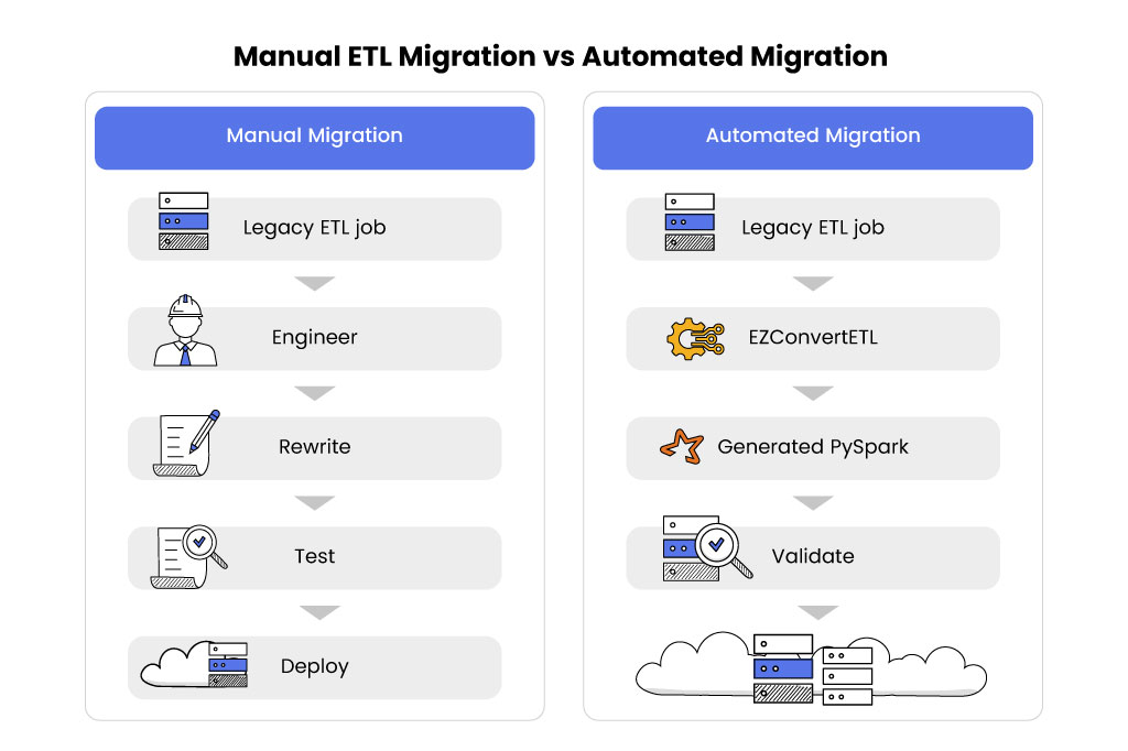 When organizations begin moving from legacy ETL tools to modern frameworks like Apache PySpark on AWS Glue, the most common approach is manual migration. Data engineers review each pipeline built in legacy platforms and rewrite the logic in PySpark.